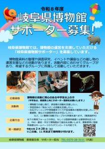 博物館における活動を通して、県民の生涯学習活動をアシストする「岐阜県博物館サポーター」(ボランティア)を募集しています。