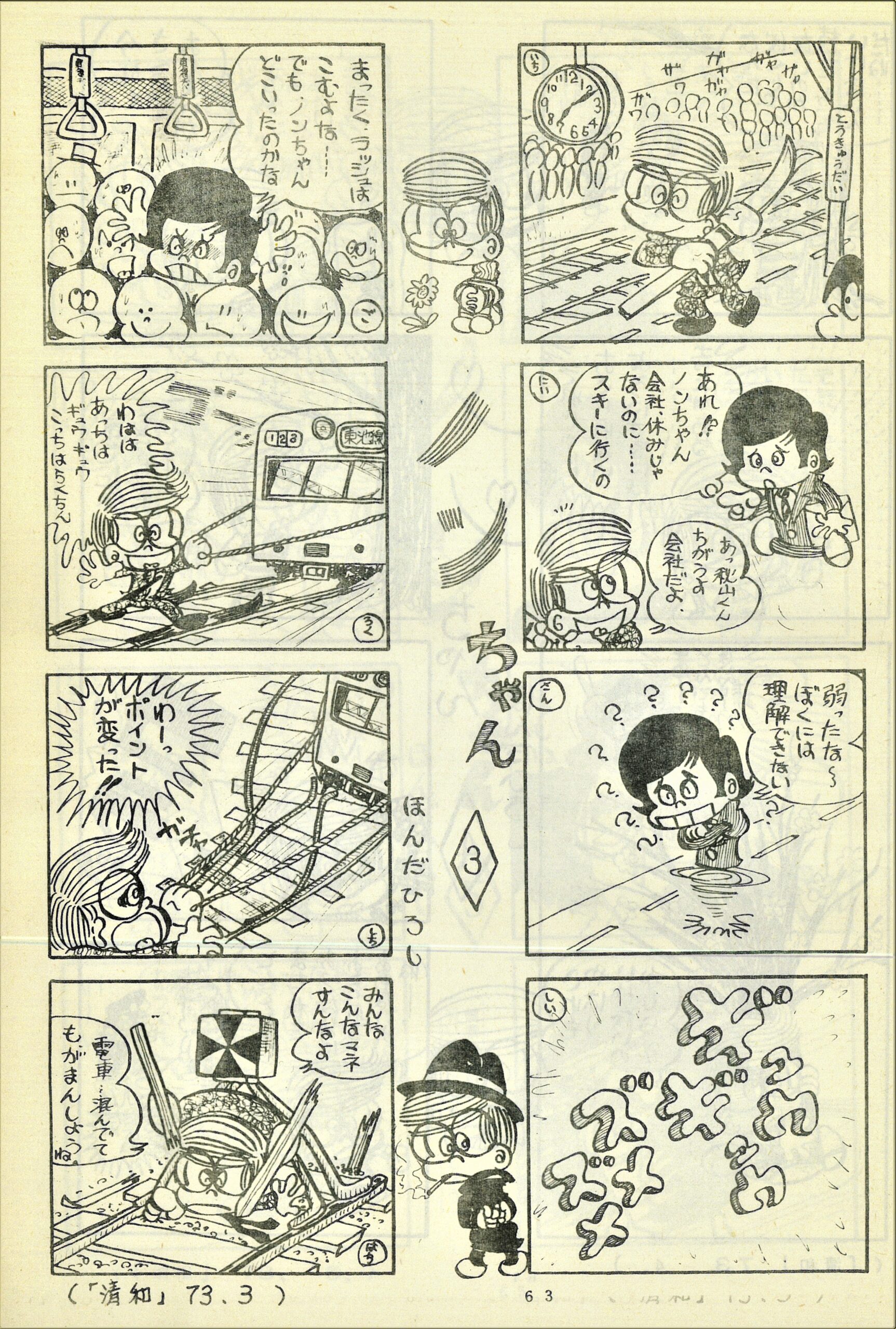 マイミュージアムギャラリー展示「鉄道コレクションと明治、大正、昭和の今」(4月11日〜5月10日)にご来場・アンケートご回答ありがとうございます。 アンケート回答特典として、出展者による1973年作の漫画をご覧ください。 こちらは会期中に来場の上、アンケートフォームに回答いただいた方限定公開です。 (東急労働組合機関誌「連結」及び、東京急行電鉄株式会社社内報「清和」掲載)