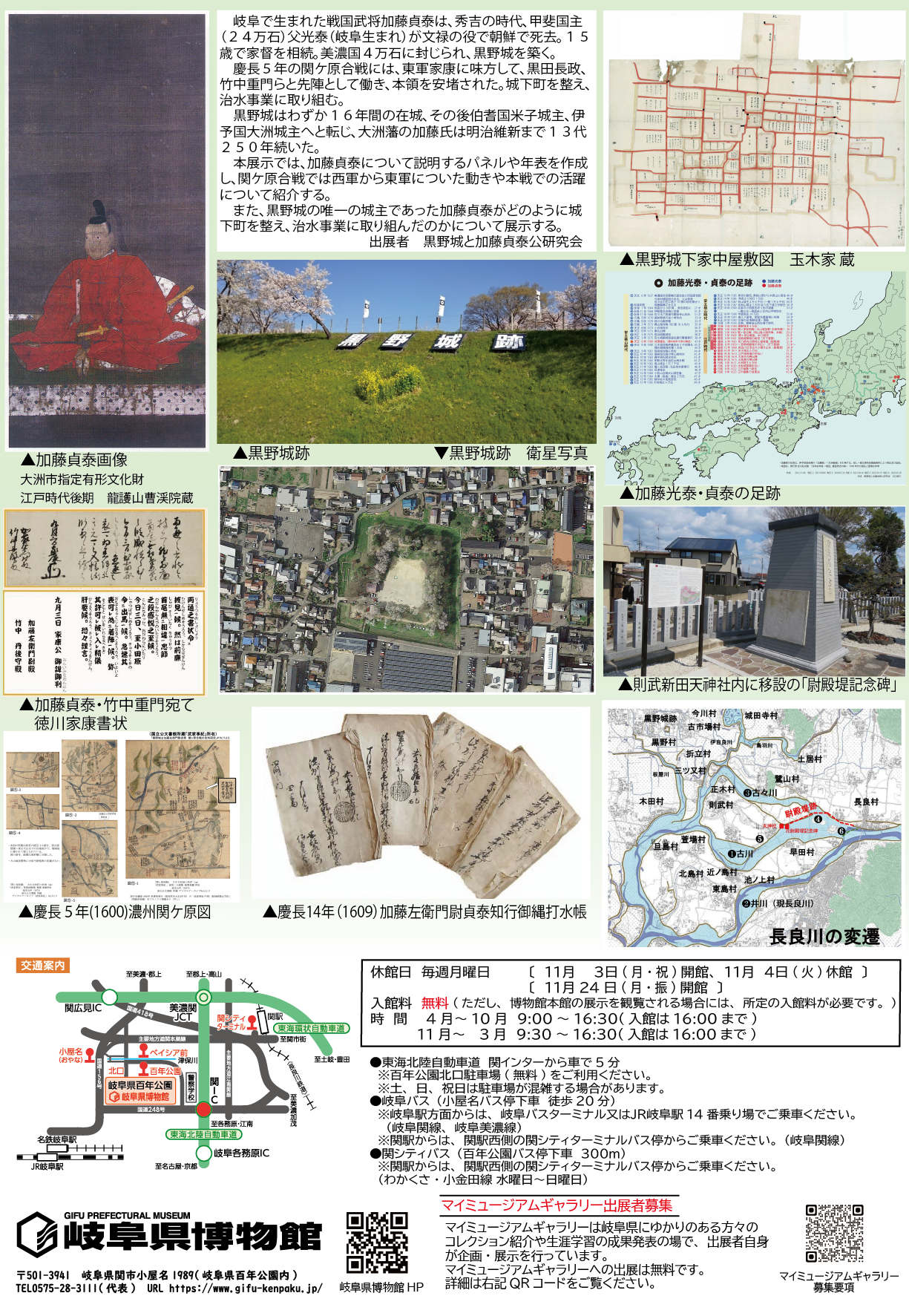 また、岐阜市黒野城の唯一の城主であった加藤貞泰がどのように城下町を整え、治水事業に取り組んだのかについて展示する。